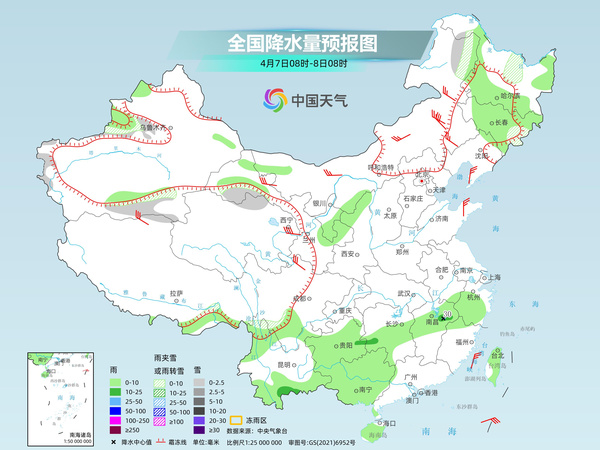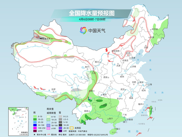昨天,我国的降水分布仍维持着北少南多的分布格局,此外,云南多地出现明显降雨,局地还出现了暴雨。监测显示,西藏中部和东北部、青海东南部、川西高原北部等地部分地区出现小到中雪或雨夹雪;新疆伊犁河谷、云南南部等地部分地区出现中雨或大雨,云南红河和西双版纳局地暴雨。