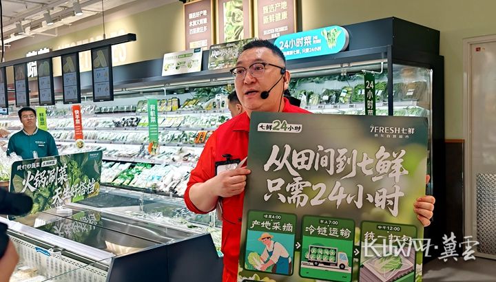 在媒体品鉴会上,京东七鲜采购与销售小万向记者介绍“24小时菜”。 长城网•冀云客户端记者 郑建卫 摄