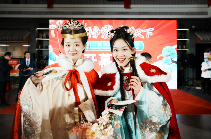 国际肉饼争霸赛现场,金陵十二钗“穿越”而来品尝肉饼。廊坊市委宣传部 供图