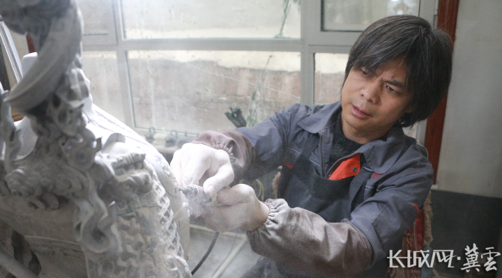 图为高英坡正在进行艺术创作。曲阳县翰鼎雕塑集团 供图