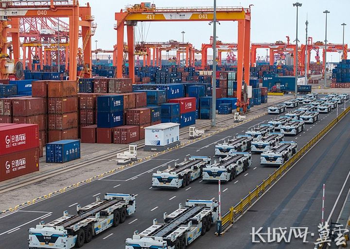 唐山港京唐港区集装箱码头堆场上智能平板运输车整装待发。赵杰 摄