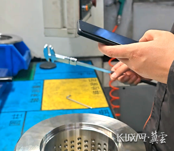机工孟二浩刚刚完成了一道加工工序,正把测量数据通过手机输入质量管理系统。 长城网•冀云客户端记者 郑建卫 摄
